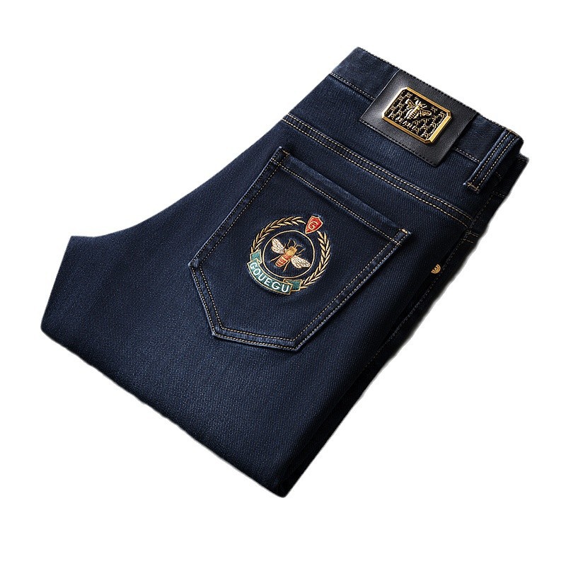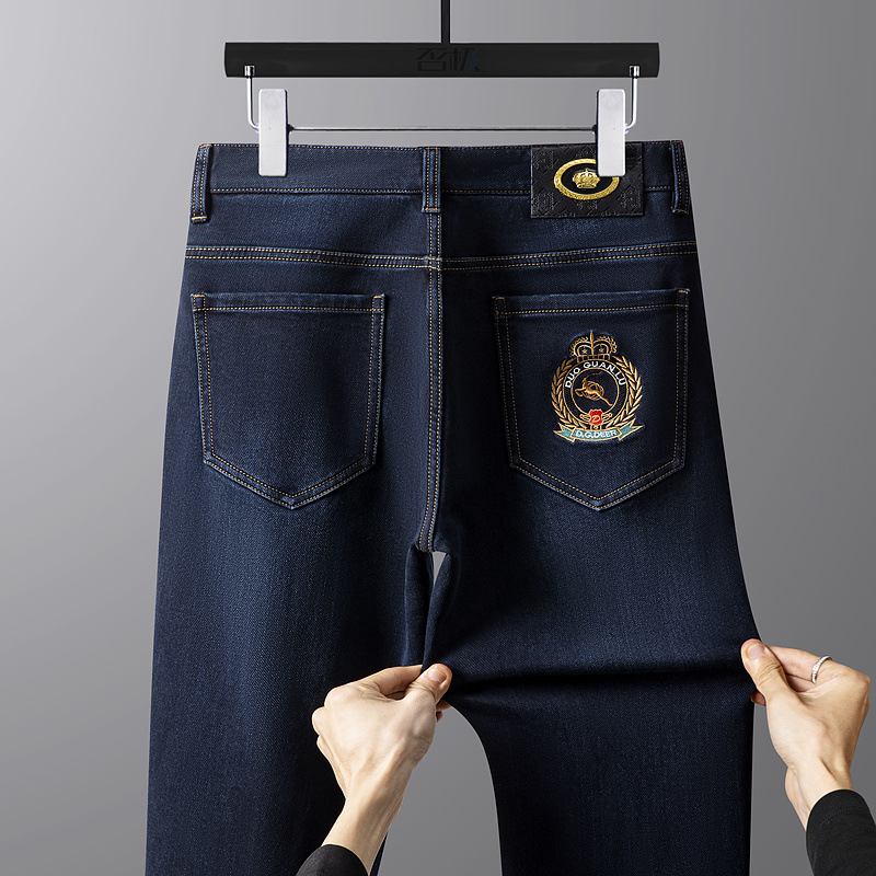 Winter Plus Velvet Thickened Men's Trousers Light Luxury Business Denim Fashion Embroidery Elastic Slim Straight Pants
